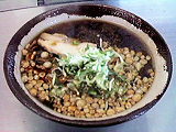 東北地方でお馴染みの伯養軒である。メニウが大體一様な伯養軒であるが、この品書きは三内丸山遺跡に因む青森獨特のものだらう。地鶏の肉が一枚、揚玉、山菜、とろろ昆布、そして胡桃が載つている豪華な蕎麦である。酸味の強い汁は、これらの具と良く合ふ。面白い一杯である。
