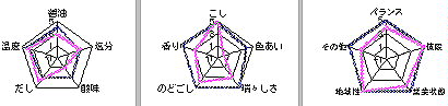 本驛は例外なので、評價をチヤートに示す。左からつゆ、めん、聰合。青線が小生の理想で桃色が當驛の蕎麦。