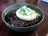 遠隔地の上 不定休の店であるので喰へない事も覺悟したが、我意天に通じたかこの名物蕎麦の賞味に成功した。汽車を降りれば小生の他に客が一人。テレビを見ながら主人が云ふには、冬は赤字なので好きな時に休む。自適に營業してゐるやうにも見えるが雪に閉ざされたこの地で70餘年も繼續するには苦勞があつただらう。 なる程、噂通りに麺が黒い。緑の安つぽい噐が黒を一層際立たせてゐるやうである。 ![]() 本驛は例外なので、評價をチヤートに示す。左からつゆ、めん、聰合。青線が小生の理想で桃色が當驛の蕎麦。 |