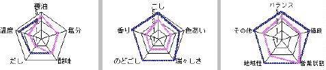 本驛は例外なので、評價をチヤートに示す。左からつゆ、めん、聰合。青線が小生の理想で桃色が當驛の蕎麦。