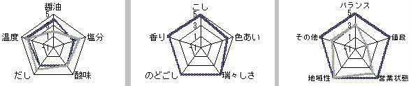 連絡船があつた當時、この驛ではホームの中央と改札付近に幾つかの立喰ひ店舗が襍然と軒を竝べてゐた。その混沌は中央通りに接し、一層の賑はひを釀し出してゐたのである。然し今日、區畫整理された新驛は奧に引込み、綺麗ではあるが活氣が無い。その新しい改札を通つて饂飩屋を探すと、ホームの店舗は閉鎖されてゐて、改札隣の四國觀光弘業が一軒だけ營業してゐた。カウンターで「蕎麦」を注文したが、矢張りこの地方でその言葉は禁句なのだらうか。しかも以前より随分と値上がりしたやうにも思ふ。觀念して出された饂飩を啜る事となつた。 ![]() 本驛は例外なので、評價をチヤートに示す。左からつゆ、めん、聰合。青線が小生の理想で桃色が當驛の蕎麦。 |