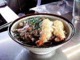 特上と呼ばれる海老が二匹、丼鉢の上で泳いでゐる。この驛の蕎麦には、どの品書きにも漏れなく「かしは肉」が付く。その甘い鶏肉エキスと、昆布出汁つゆの融合、海老天の歯触り、ふやけた衣。