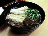 夜には勤め帰りのサラリーマン諸君が、このカウンターに集ふのだらう。氣の所爲だらうか、そのつゆの味に酒のやうな味を感じた。これが味全體を拡散させて、甘くも辛くもない中庸なつゆに仕立ててゐる。牛蒡の天夫羅の食感と色の良い冷凍めんを一氣に胃袋へ収めた。